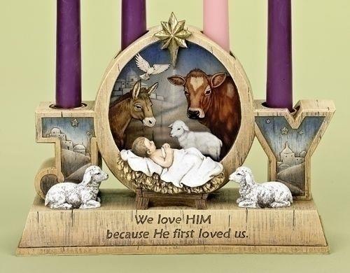 Joy Advent Candle Stand has the images of the Baby Jesus and stable animals holds the four advent candles. Boxed. Your choice of an Advent candle set is extra.