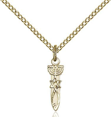 Menorah, Star & Fish medal, Gold Filled. Medal measures 1/2 x 1/8. Made in the USA. Manufacturers lifetime guarantee. Gift boxed.