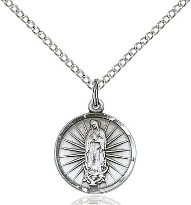 Our Lady of Guadalupe medal, Solid Sterling Silver. Medal measures 5/8 X 1/2. Made in the USA. Manufacturers lifetime guarantee. Gift boxed.