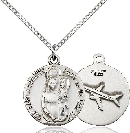 Our Lady of Loretto medal, Solid Sterling Silver. Medal measures 3/4 x 5/8. Made in the USA. Manufacturers lifetime guarantee. Gift boxed.