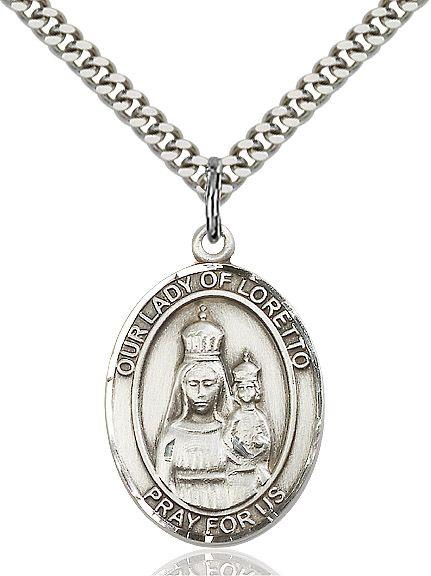 Our Lady of Loretto medal, Solid Sterling Silver. Made in the USA. Manufacturers lifetime guarantee. Gift boxed.