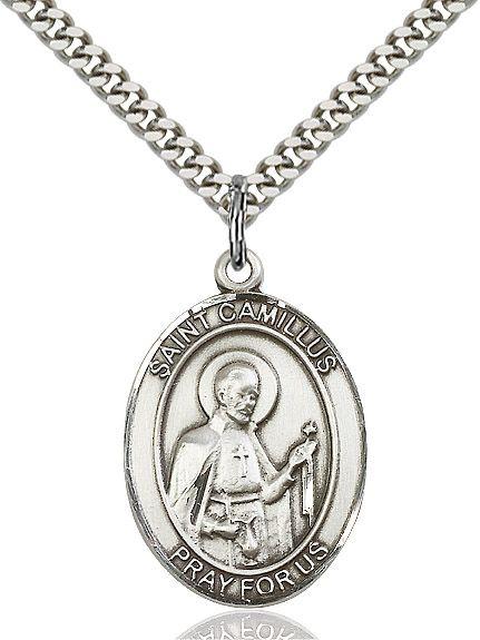 Saint Camillus of Lellis medal, Solid Sterling Silver. Made in the USA. Manufacturers lifetime guarantee. Gift boxed.