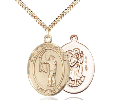 Archery with Saint Christopher medal, Gold Filled. Made in the USA. Manufacturers lifetime guarantee. Gift boxed.