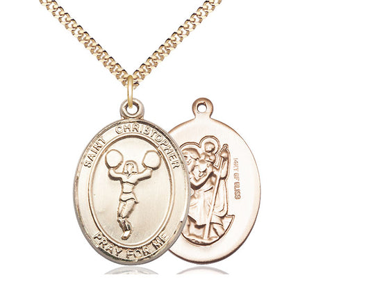Cheerleading with Saint Christopher medal, Gold Filled. Made in the USA. Manufacturers lifetime guarantee. Gift boxed.