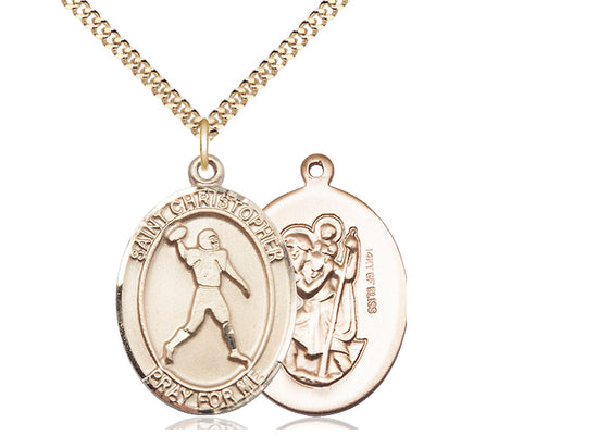 Football with Saint Christopher medal, Gold Filled. Made in the USA. Manufacturers lifetime guarantee. Gift boxed.