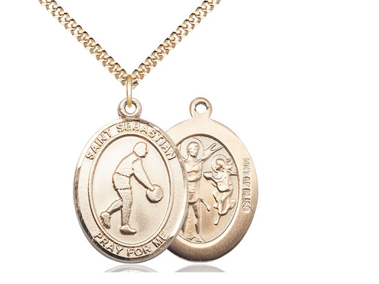 Basketball with Saint Sebastian medal, Gold Filled. Made in the USA. Manufacturers lifetime guarantee. Gift boxed.