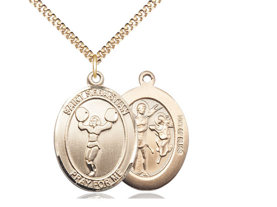 Cheerleading with Saint Sebastian medal, Gold Filled. Made in the USA. Manufacturers lifetime guarantee. Gift boxed.