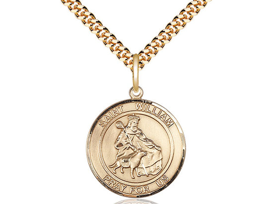 Saint William of Rochester round medal, Gold Filled. Made in the USA. Manufacturers lifetime guarantee. Gift boxed.